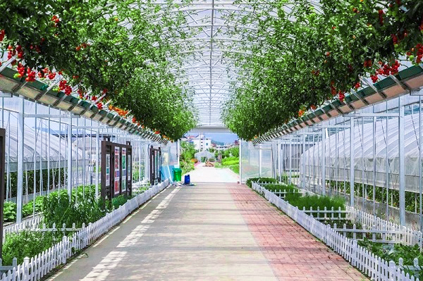 番茄長廊,番茄被種在了空中,你擔(dān)心澆水施肥嗎?不用怕,一鍵可以搞定。在番茄棚下面埋著長長的水管,澆水施肥通過管道就可以實現(xiàn)!