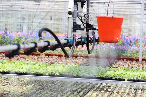 灌溉系統(tǒng),在大棚里正在培育夏季的蔬菜秧苗。幼苗很金貴,噴灑式灌溉既平均又方便!