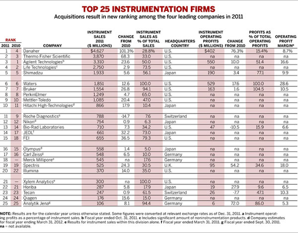 2011年6月,丹納赫以68億美元收購(gòu)貝克曼庫(kù)爾特,這一交易使丹納赫與儀器相關(guān)的銷售額翻番,推動(dòng)該公司從2010年TOP25排行榜中的第四位上升至今年的第一位。在C&EN2009年TOP25排行榜中,丹納赫曾排名第九。算上貝克曼庫(kù)爾特的銷售收入,丹納赫與儀器相關(guān)的銷售額增長(zhǎng)約7%。