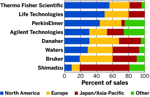全球排名前八的儀器公司各地區(qū)銷售額所占比重