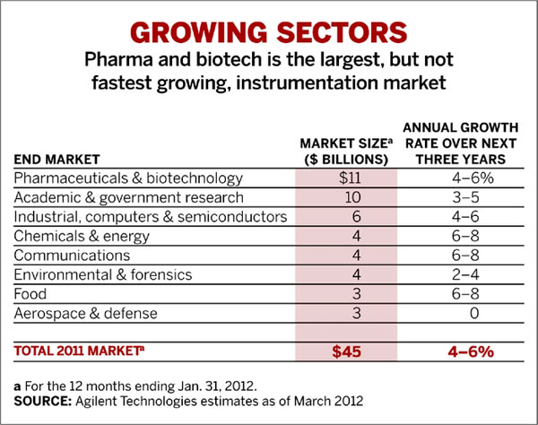 根據(jù)總部位于洛杉磯的市場(chǎng)研究公司SDI的報(bào)告,2011年,全球儀器市場(chǎng)增長(zhǎng)率約為7.1%,銷售額達(dá)424億美元。而對(duì)于今年,SDI的預(yù)測(cè)更適度,更具代表性,增長(zhǎng)率預(yù)計(jì)為5.5%,而行業(yè)的總收入則高達(dá)447億美元。