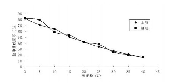 3.2 隨著燕麥粉含量的增加,拉伸兩種樣品的面團所需能量(拉伸曲線面積)均逐漸減小。燕麥精粉混粉樣品的拉伸曲線變化幅度較大,而燕麥全粉混粉樣品的拉伸曲線的變化很規(guī)律,接近線性變化,這樣就較容易控制其品質(zhì)的變化。
