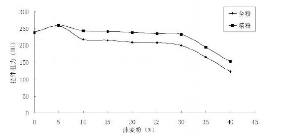 由此可見,由于在燕麥粉含量為10% ~30%時,燕麥粉添加量對混粉面團的拉伸阻力的影響不大,兼顧燕麥粉的營養(yǎng)價值和面團的拉伸阻力指標,建議在制作燕麥全粉混粉面食品和燕麥精粉混粉面食品時兩種燕麥粉的添加量均控制在10% ~30%。