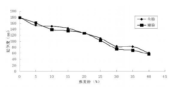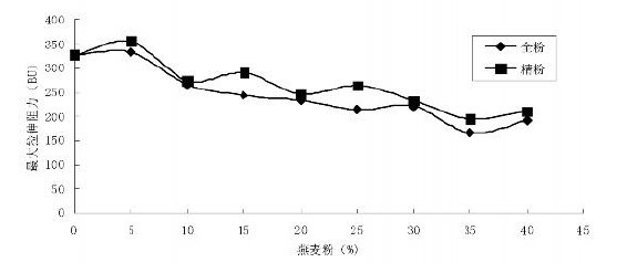 具體作用機理是:麩皮對混粉面團的面筋結(jié)構(gòu)起到松散作用,使得拉伸阻力下降。在燕麥粉含量為0%~5%時,由于燕麥全粉含量較少,所以少量麩皮對燕麥全粉混粉面團的拉伸阻力影響很小,所以燕麥全粉混粉面團的拉伸阻力和燕麥精粉混粉面團的拉伸阻力很接近。在燕麥粉含量為5% ~40%時,隨著燕麥粉含量的增加,麩皮對混粉面團拉伸阻力的影響很顯著。表現(xiàn)為燕麥精粉混粉樣品的拉伸阻力大于燕麥全粉混粉樣品的拉伸阻力。