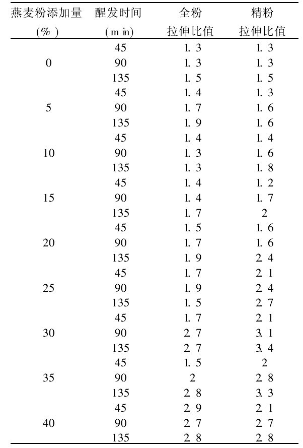 3.5 燕麥粉添加量、醒發(fā)時間對拉伸比值都產(chǎn)生影響。在精粉混粉樣品中,各個配比的混粉樣品隨著時間的增加,拉伸比值均有增大趨勢。在全粉混粉樣品中,燕麥粉含量為5%、15%、20%、30%、35%時,拉伸比值有增大趨勢。當燕麥粉含量為10%、25%、40%時,隨著醒發(fā)時間的增加,拉伸比值變化不穩(wěn)定。
