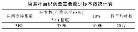 表是關(guān)于用這種簡易測定法,調(diào)查葉面積需要的標(biāo)本數(shù)。主莖第6節(jié)和第11節(jié)上著生的總?cè)~面積的株間差異,從對40株的分析結(jié)果推定系數(shù)為31%,可靠水平68%,目標(biāo)精度5%,需要的標(biāo)本數(shù)為39株(10%,精度10株)。