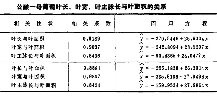 每年再用同樣的方法,測(cè)定公釀一號(hào)葡萄葉片30枚,將測(cè)定的葉長、葉寬和葉主脈長,分別代入所求方程鄉(xiāng),求出葉面積鄉(xiāng),同時(shí)用光電葉面積儀樹定葉片的實(shí)測(cè)值作為對(duì)照,檢驗(yàn)該方程式的估算值與實(shí)測(cè)值的偏離情況。