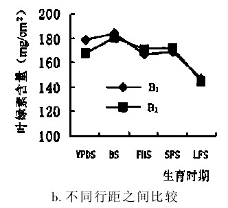 進一步對各生育時期葉片葉綠素含量進行方差分析的結果表明(表1),各個生育時期影響葉片葉綠素含量的主要因素不同。在幼穗分化期,主要受插秧量的影響,不同插秧量之間葉綠素含量差異極顯著,即插單苗的葉綠素含量極顯著地高于插三苗的。而行距和品種對葉綠素含量的影響反而不明顯。到齊穗期,不同插秧量對葉綠素含量的影響依然存在,但葉綠素含量已經開始主要受品種決定,開始表現(xiàn)出品種本身的特性:遼優(yōu)3225的葉綠素含量高于遼粳326,又極顯著高于屜優(yōu)418。而到了灌漿盛期,葉綠素含量幾乎完全由品種決定,品種本身的特性充分體現(xiàn)出來,此時3個品種的葉綠素含量差異更大,遼優(yōu)3225極顯著高于遼粳326,而遼粳326又極顯著高于屜優(yōu)418。灌漿后期由于葉片逐漸衰老,各種因素的作用已經不是很明顯。這說明水稻葉片葉綠素含量前期主要受栽培環(huán)境條件制約,而后期主要由品種自身特性所決定。