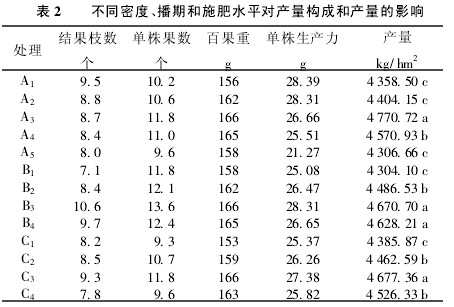 密度為21.0萬株/hm2時,結莢期的葉面積指數(shù)達7.39,然后到飽果成熟期迅速下降,這是由于密度過大,遮蔭嚴重,導致下部葉片過早衰落的結果;而密度為16.5萬株/hm2時,葉面積指數(shù)最高為4.25,未能充分利用光能,群體產(chǎn)量低;當密度為19.5萬株/hm2時,最高葉面積指數(shù)為5.96,且能保持較長時間,能充分利用光能,通風透光良好,因而產(chǎn)量最高。