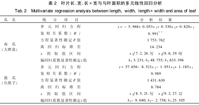 多元線性回歸分析其復相關系數(shù)為R=01991和01989,均達極顯著水平,多元線性回歸公式的常數(shù)項絕對值都很小(表2),表明其測算準確受葉片大小的影響甚小。