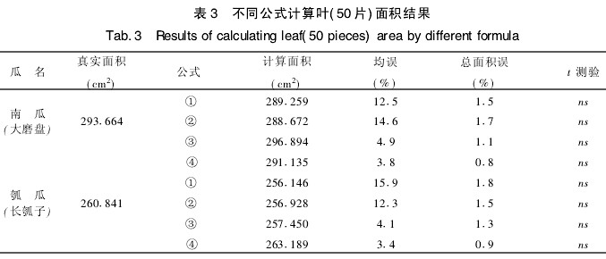 于另一時間不同地點對兩作物各任意采50片不同大小且有形狀代表性的葉子,按上述方法測每片葉子的長、寬及真實面積。再以各回歸公式計算其面積。最后求出兩作物各50片葉的各式的測算面積平均值和平均測算誤差、總面積測算誤差(測算總面積和真實總面積之間的誤差),并對各公式求得的測算面積平均值與實際面積平均值的差異顯著性按按成組法進行t測驗。