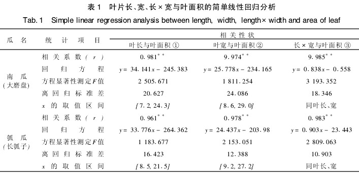 對兩作物各任意選取20株為采葉株,于結果盛期在每植株上采不同葉齡、不同大小且有形狀代表性的4~6片葉,即南瓜和瓠瓜各100片葉。再用直尺測每片葉子的長(中脈長)和寬(最大寬度),用浙江托普儀器生產(chǎn)的激光葉面積儀測定每片葉子的面積(過大的葉片分幾部分測后相加即得該片葉面積),以此作為真實面積。然后對葉長、葉寬、葉長@寬與葉面積進行簡單線性回歸分析和多元線回歸分析,得出葉面積的測算公式。