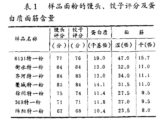 徐州、369特一粉的蛋白質(zhì)含量、面筋含量較低些,分別在11.6帕和27務(wù)左右。它們的饅頭、水佼的綜合評(píng)分在70分以上。蒸煮品質(zhì)屬較好.綿陽(yáng)特一粉的面筋含量很低,只有23.5腸,但由于其面筋質(zhì)量尚屬較好,故它的蒸煮品質(zhì)勉強(qiáng)可以接受,饅頭、餃子的綜合評(píng)分分別為67分、68分。