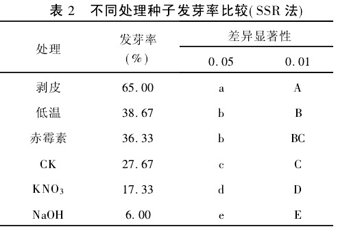 觀察種子前7d發(fā)芽情況,統(tǒng)計(jì)其發(fā)芽勢,對(duì)發(fā)芽勢經(jīng)反正弦轉(zhuǎn)換后作方差分析,結(jié)果見表1。從表1可以看出:采用剝皮、低溫和赤霉素溶液浸種處理的種子其發(fā)芽勢高于對(duì)照,其中以剝皮處理的種子發(fā)芽勢最高。分析表明:剝皮能極顯著提高菠菜種子的發(fā)芽勢,低溫處理能顯著提高菠菜種子的發(fā)芽勢;采用KNO3和NaOH溶液進(jìn)行浸種處理能顯著或極顯著擬制種子的發(fā)芽勢;采用赤霉素溶液處理的種子與對(duì)照差異不顯著。