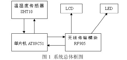 本系統(tǒng)以單片機(jī)AT89C52為微處理器對(duì) SHT10 和 NRF905 器件進(jìn)行控制,溫濕度傳感器作為測(cè)量檢測(cè)器件對(duì)環(huán)境溫度濕度等因子進(jìn)行數(shù)據(jù)采集,無(wú)線傳輸模塊NRF905對(duì)采集到的數(shù)據(jù)進(jìn)行無(wú)線傳輸,傳輸?shù)臄?shù)據(jù)以指示燈 LCD顯示,從而更好的控制室內(nèi)環(huán)境。系統(tǒng)的總體結(jié)構(gòu)框圖如下圖1所示: