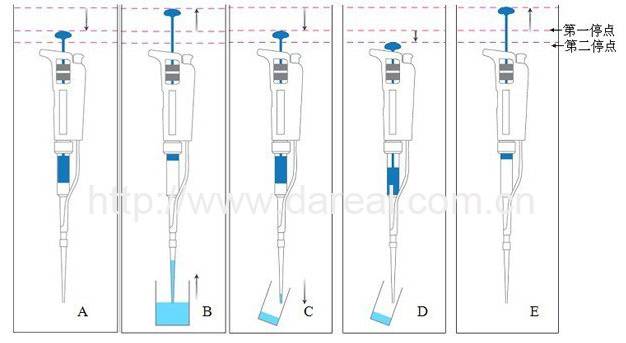 ① 將移液器吸頭口貼到容器內(nèi)壁底部并保持傾斜,這樣可以避免因水張力堵住管口,平穩(wěn)地把移液器按鈕壓到第一停點(diǎn)(圖C),再把移液器按鈕壓到第二停點(diǎn)以排出剩余液體(圖D)。