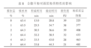 我們將全脂豆粉添加到面粉中,添加比例分別為1%、2%、3%、4%、5%,然后通過電子型粉質(zhì)儀研究全脂豆粉對面團(tuán)粉質(zhì)特性的影響,結(jié)果見表1。