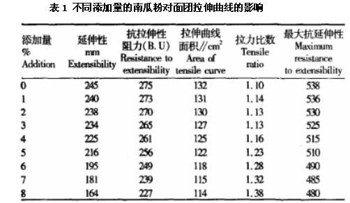 南瓜粉就是將南瓜進(jìn)行加工制作而成的粉末,南瓜粉含有豐富的蛋白質(zhì)、膳食纖維、維生素等營養(yǎng)元素,適量的使用對(duì)人體十分有好處。有研究表明,南瓜粉不僅具有舒筋活血及防止皮膚破裂和防癌等作用,同時(shí)還助于人體發(fā)育、增強(qiáng)人體內(nèi)的免疫等功能,因此,南瓜粉被廣泛應(yīng)用于天然保健營養(yǎng)品。本文通過電子拉伸儀研究不同南瓜粉的添加量對(duì)面團(tuán)拉伸曲線的影響。