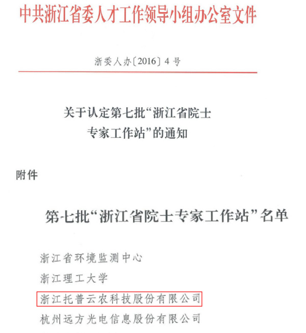 7月25日,中共浙江省委人才工作領導小組辦公室公布了第七批“浙江省院士專家工作站”名單,此次共有22家單位上榜,杭州市2家。浙江省托普云農(nóng)科技股份有限公司(以下簡稱“托普云農(nóng)”)成為浙江農(nóng)業(yè)信息化領域內(nèi)第一家獲此殊榮的企業(yè)。