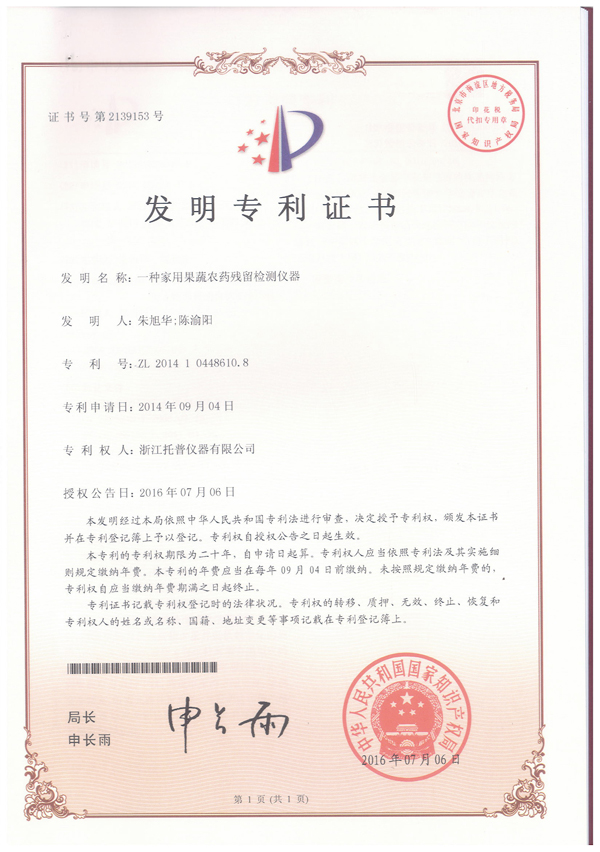 浙江托普云農(nóng)科技股份有限公司(股票代碼:833692)申請的“一種家用果蔬農(nóng)藥殘留檢測儀器”發(fā)明專利申請,已于2016年7月6日獲得中華人民共和國國家產(chǎn)權(quán)局頒發(fā)的發(fā)明專利證書。
