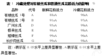 通過(guò)種子低溫低濕儲(chǔ)藏柜的研究,并結(jié)合表1,我們可以從中得知,冷藏處理沒(méi)有降低普通絲瓜花粉的活力,而有棱絲瓜花粉的活力略有上升,有棱絲瓜品種間、普通絲瓜品種間以及有棱絲瓜和葡萄絲瓜品種間新鮮花粉和冷藏花粉的活力差異均不顯著。冷藏處理有棱絲瓜花粉的活力略有上升,可能與采花朵的時(shí)間有關(guān),普通絲瓜是花開1h后采取的,而有棱絲瓜的新鮮花粉是花開后立即采取的,這就說(shuō)明絲瓜雄花開放后一段時(shí)間花粉活力才達(dá)到最高峰。
