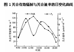作物的光合作用是作物生長過程中物質(zhì)積累與生理代謝的基本單元,自然條件下植物的光合作用隨著內(nèi)外因子的變化而時刻發(fā)生變化,而光合有效輻射是植物進行光合作用的重要能源。以2007年9月19日測定的光合速率p n和光合有效輻射日變化代表,如圖1所示。