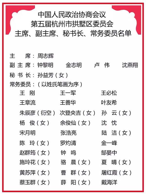 中國(guó)人民政治協(xié)商會(huì)議第五屆杭州市拱墅區(qū)委員會(huì)委員名單